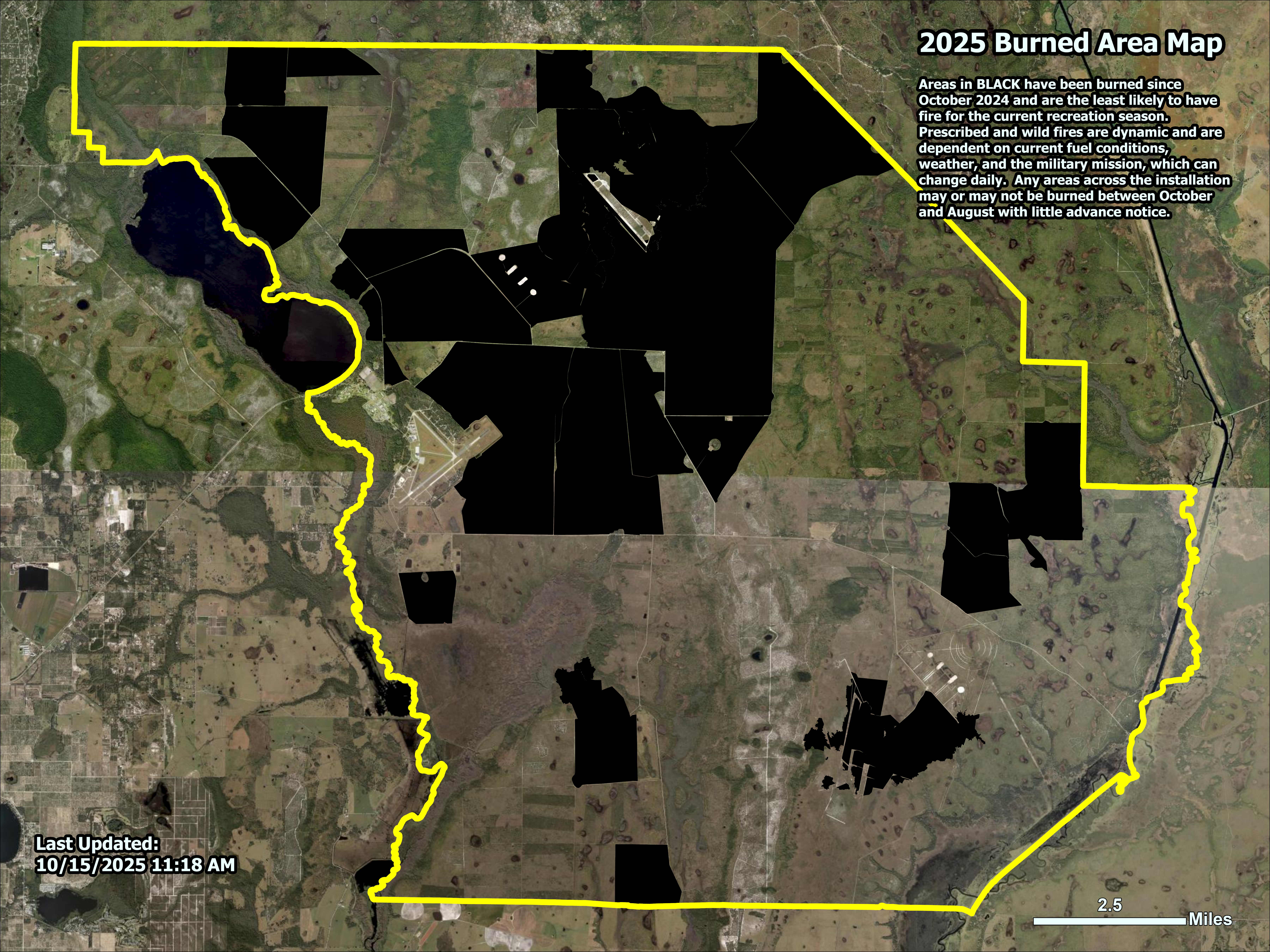 UPDATED October 2025: Areas in BLACK have been burned since October 2024 and are the least likely to have fire for the current recreation season. Prescribed and wild fires are dynamic and are dependent on current fuel conditions, weather, and the military mission, which can change daily. Any areas across the installation may or may not be burned between October and August with little advance notice.